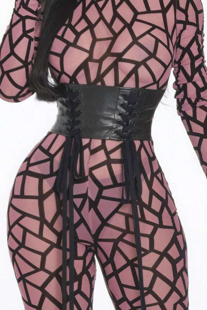 Step into style with our Geometric Printed Jersey Jumpsuit, a striking piece that combines comfort and fashion-forward design. Crafted from stretchy mesh fabric, this jumpsuit features a leather corset design and a bold geometric pattern, making it a standout choice for any occasion.
